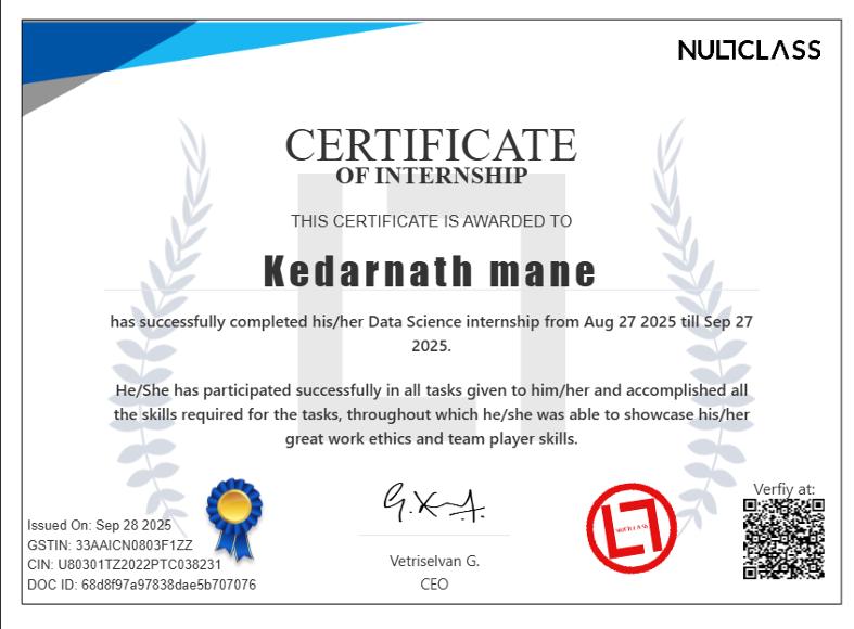 Experience: Kedar Mane, Junior Data Science Intern - NullClass